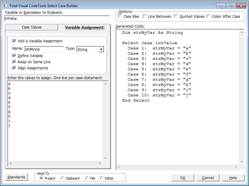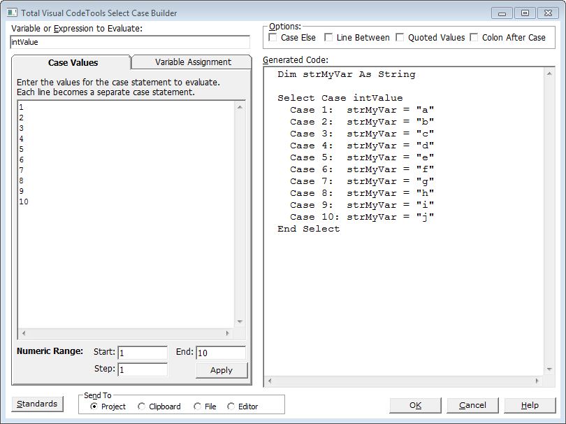 Something as simple as a Select Case statement should not be hard! Use the Select Case builder to quickly create multi-branching statements. Simply enter your variable name, type or paste your test expressions (or specify a numeric range), and Total Visual CodeTools generates the code for you. Options let you specify the addition of an Else statement and formatting styles: