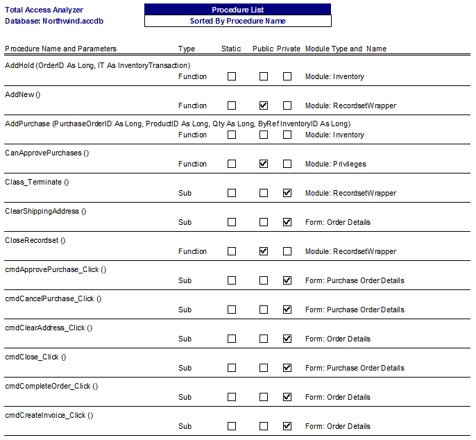 Microsoft Access Module Procedure Definition List Sorted by Procedure Name