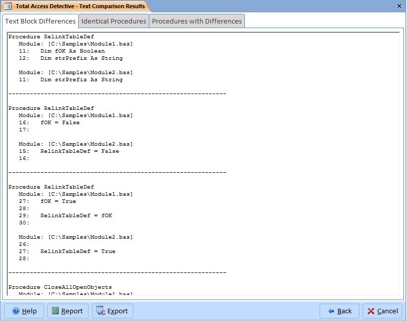 Specify whether you want standard text comparison or code comparison. Text comparison just compares lines. Code comparison matches procedure-to-procedure (regardless of order) and then line-by-line within the procedure so you can see what really changed even if procedures are added, deleted or sorted. Total Access Detective understands Visual Basic/VBA syntax, so you can use this feature to compare modules from any Office program (Excel, Outlook, Word, etc.) or VB6.
