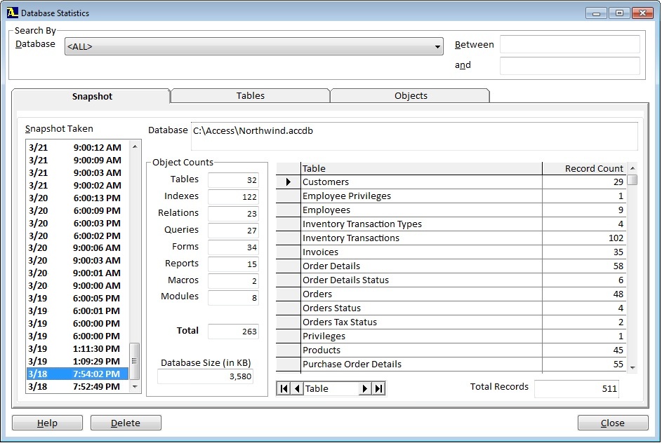 The View, Database Statistics form shows the total number of records in the database and improves formatting to better see and compare the database contents over time. The table numbers now include separate Local, Linked, and System table counts.