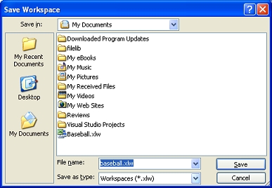 If you always open a group of spreadsheets together, you can create an Excel workspace that simplifies this task. Using Excel Workspaces, you can open and organize a set of related workbooks, and save the arrangement for later use. Just open the workbooks that you use together, arrange them, and save the workspace. Later on, open the workspace file (*.xlw) to pick up where you left off. Think of workspaces as a shortcut to a group of files in a particular view. The workspace does not contain the workbooks, it just points to them.