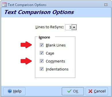 addition to ignoring differences due to case or indentations. These options are now available under Text Options.
