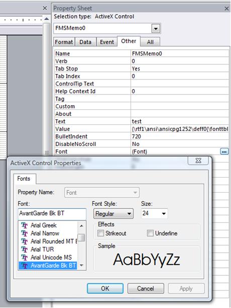 Private Sub Form_Load() Me.FMSMemo0.Object.Font.Name = "Arial" Me.FMSMemo0.Object.Font.Size = 14 Me.FMSMemo0.Object.Font.Bold = True End Sub